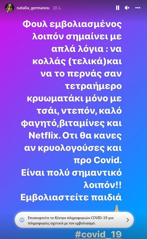 «Ότι θα έκανες αν κρυολογούσες και προ Covid. Είναι πολύ σημαντικό λοιπόν!! Εμβολιαστείτε παιδιά» έγραψε χαρακτηριστικά η Ναταλία Γερμανού