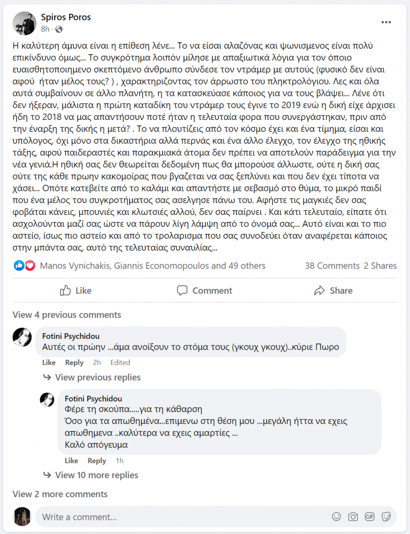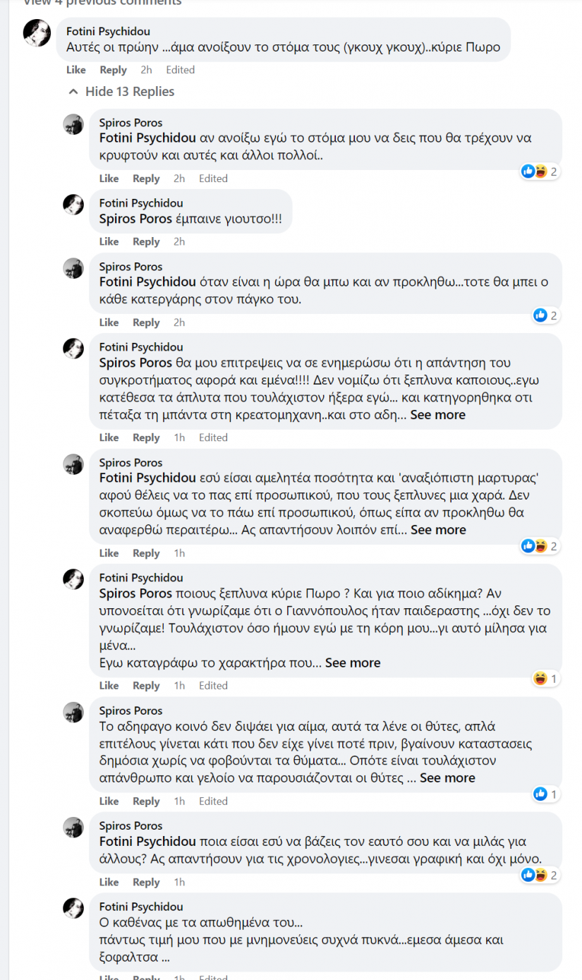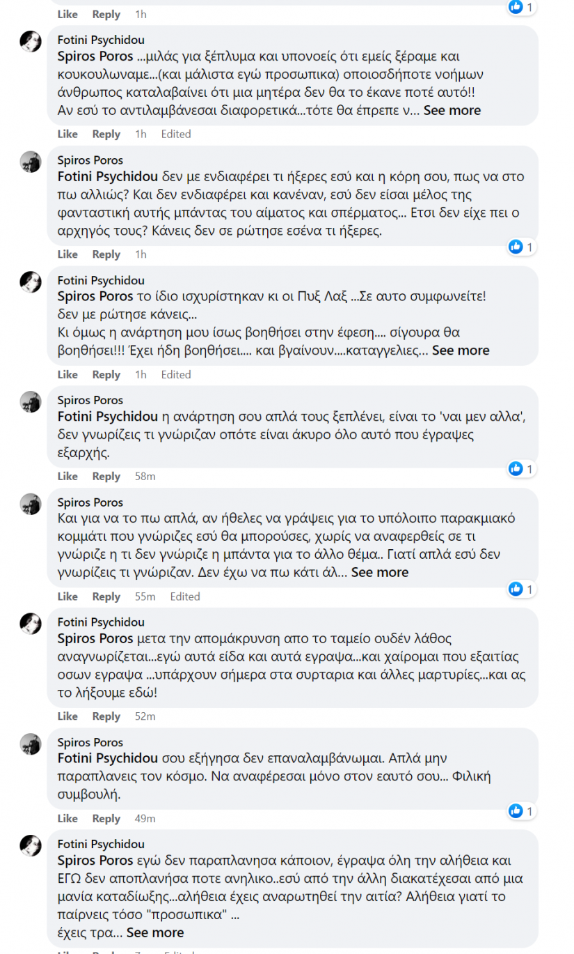 Τα όσα υποστήριξε προκάλεσαν την αντίδραση του Σ.Πώρου, ο οποίος με ανάρτηση του στο Facebook ισχυρίστηκε ότι η πρώην του προσπάθησε να τους «ξεπλύνει». Αυτό που ακολούθησε ήταν ένας άγριος διαδικτυακός καβγάς.