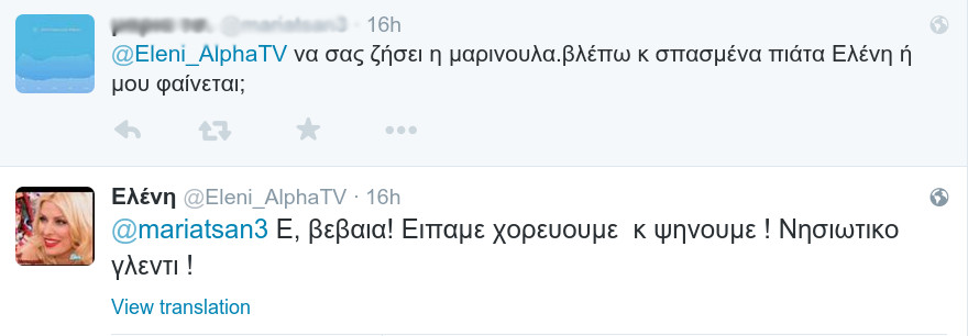 «Και το γλέντι συνεχίζεται» έγραψε η παρουσιάστρια πριν από μερικές ώρες στο Twitter, αναρτώντας μια φωτογραφία με οργανοπαίχτες και σπασμένα πιάτα, καθώς, όπως παραδέχθηκε και η ίδια απαντώντας σε διαδικτυακή της φίλη, το γλέντι ήταν τρικούβερτο, νησιώτικο και τα είχε όλα.