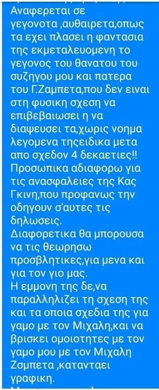 Αυτή τη φορά, δεν άντεξε και ξέσπασε γράφοντας μεταξύ άλλων πως παραδέχεται ότι υπήρξε μια σχέση μεταξύ του Μιχάλη Ζαμπέτα και της κυρίας Γκίνη, πριν το γάμο με την ίδια, ωστόσο, όσα λέγονται είναι περσινά ξινά σταφύλια και την εκθέτουν, σημειώνοντας πως όλα αυτά είναι αποτέλεσμα της ανάγκης για αυτοπροβολή και είναι κάτι που έχει καταντήσει εμμονή. Στο τέλος μάλιστα, δεν δίστασε να τη συμβουλεύσει να σταματήσει, για να μην εκτίθεται άσκοπα.