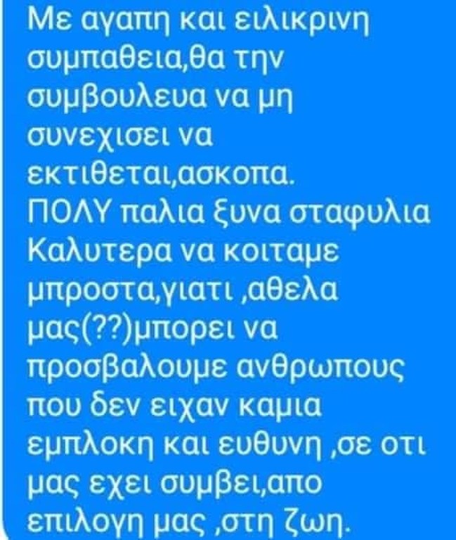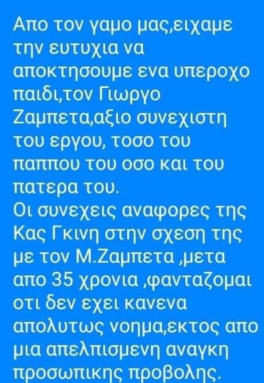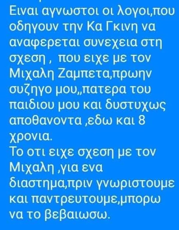 Αυτή τη φορά, δεν άντεξε και ξέσπασε γράφοντας μεταξύ άλλων πως παραδέχεται ότι υπήρξε μια σχέση μεταξύ του Μιχάλη Ζαμπέτα και της κυρίας Γκίνη, πριν το γάμο με την ίδια, ωστόσο, όσα λέγονται είναι περσινά ξινά σταφύλια και την εκθέτουν, σημειώνοντας πως όλα αυτά είναι αποτέλεσμα της ανάγκης για αυτοπροβολή και είναι κάτι που έχει καταντήσει εμμονή. Στο τέλος μάλιστα, δεν δίστασε να τη συμβουλεύσει να σταματήσει, για να μην εκτίθεται άσκοπα.