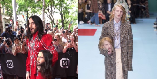 Η συγκεκριμένη εμφάνιση αποτελεί αναφορά στο πρόσφατο fashion show της Gucci, στο οποίο τα μοντέλα εμφανίστηκαν στην πασαρέλα κρατώντας τα κεφάλια τους.