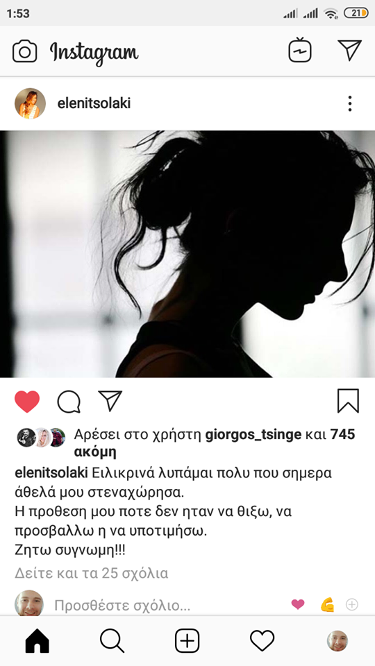 Η πανελίστρια λίγο μετά τη μια το βράδυ της Πέμπτης, ποστάρε μια φωτογραφία με μια σκιά γυναίκας και γράφει «Ειλικρινά λυπάμαι πολύ που σήμερα άθελά μου στεναχώρησα.Η πρόθεσή μου πότε δεν ήταν να θίξω, να προσβάλλω η να υποτιμήσω. Ζητώ συγγνώμη.