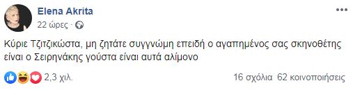 Σχολιάζοντας τα λεγόμενά του η Έλενα Ακρίτα έγραψε: «Κύριε Τζιτζικώστα, μη ζητάτε συγγνώμη επειδή ο αγαπημένος σας σκηνοθέτης είναι ο Σειρηνάκης γούστα είναι αυτά αλίμονο».