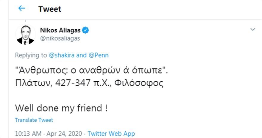 Ανάμεσα σε όσους σχολίασαν το tweet ήταν και ο Νίκος Αλιάγας, ο οποίος της έστειλε τα συγχαρητήριά του, με μια ρήση του Πλάτωνα.