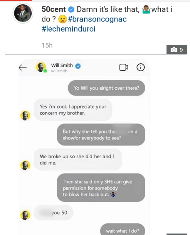 Σύμφωνα με την Page Six, σε μηνύματα που αντάλλαξαν οι δυο σταρ, ο 50 Cent αναφέρθηκε σε εκπομπή που εμφανίστηκαν ο ηθοποιός και η πρώην γυναίκα του Τζέιντα Πίνκετ Σμιθ, μετά τις αποκαλύψεις ότι η τελευταία διατηρούσε δεσμό με τον 27χρονου τραγουδιστή Όουγκουστ Αλσίνα.