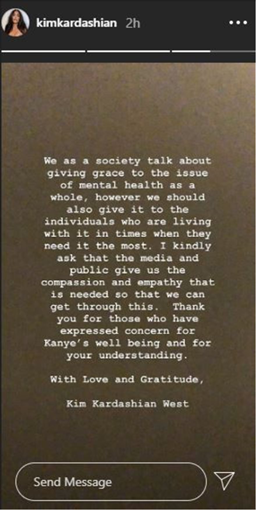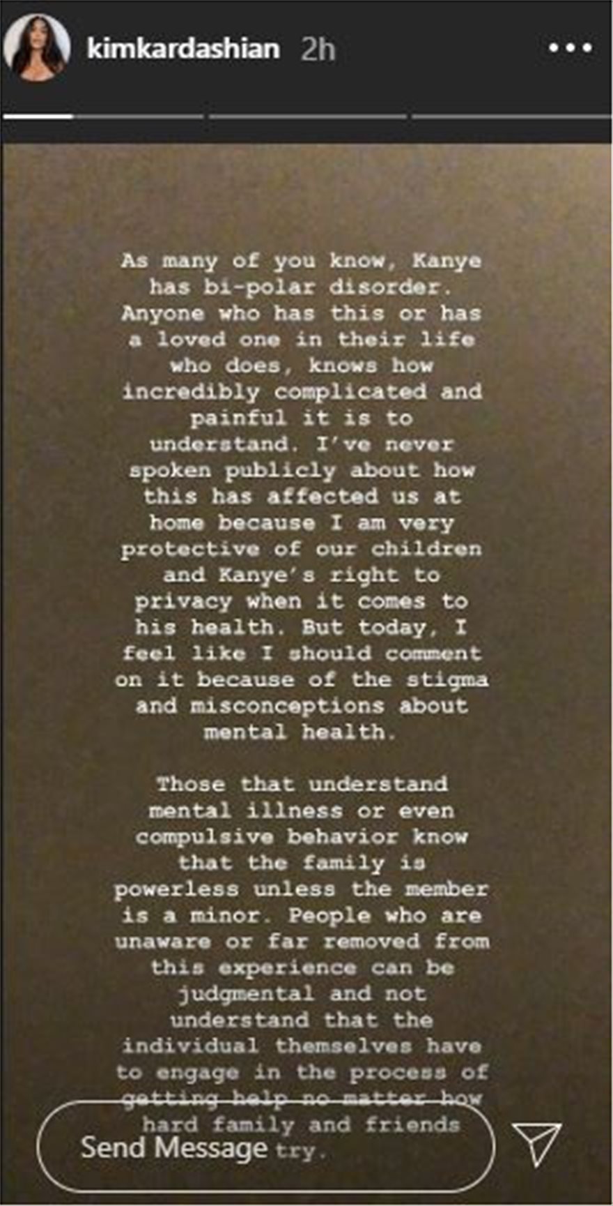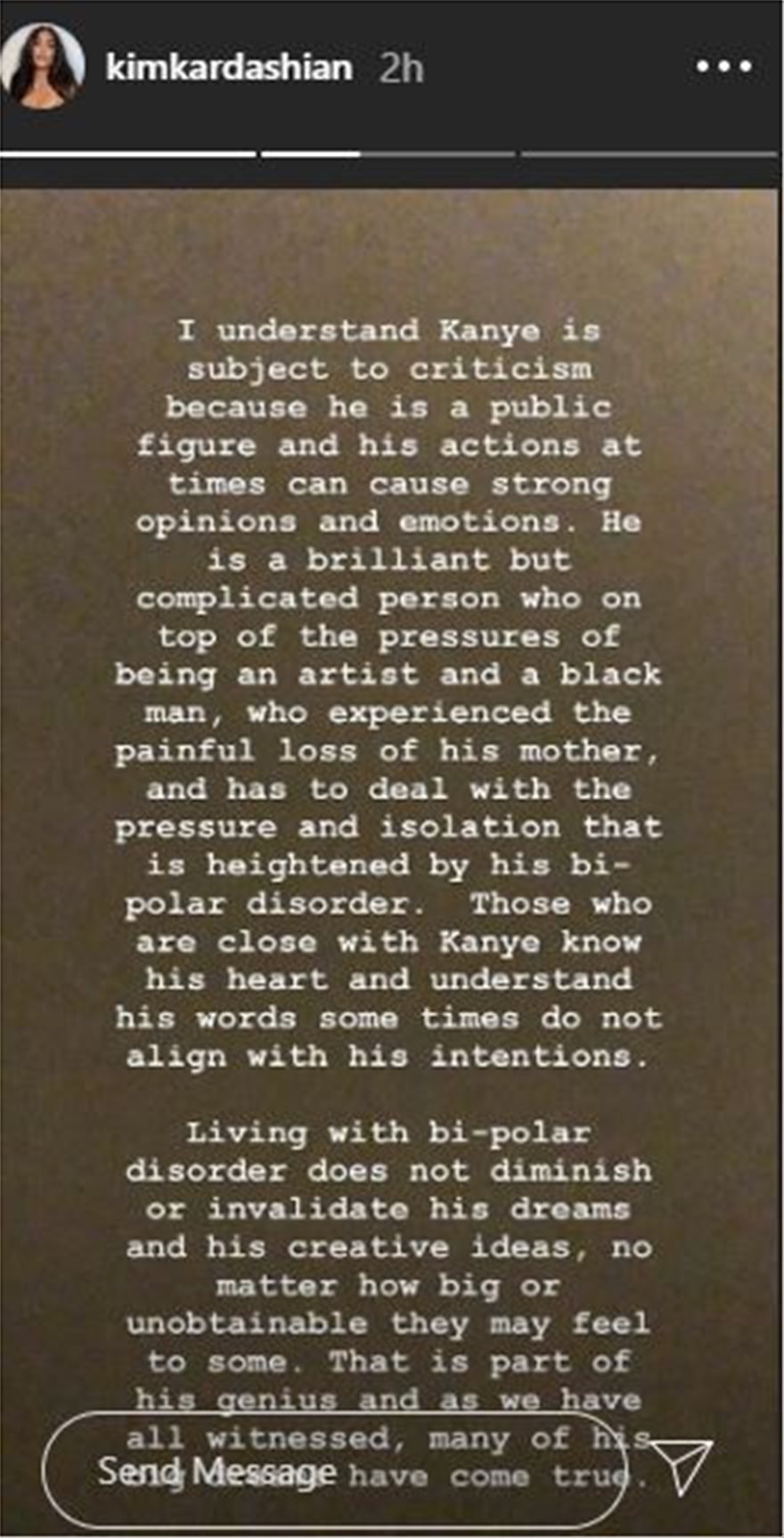 Στην μακροσκελή της ανάρτησή της στο Instagram αναφέρει η Κιμ: Ωστόσο σήμερα, νιώθω πως πρέπει να τοποθετηθώ λόγω του στίγματος ή των παρερμηνειών για την ψυχική υγεία. Για εκείνους που αντιλαμβάνονται τις ψυχικές ασθένειες και ψυχαναγκαστικές συμπεριφορές, ξέρουν πως η οικογένεια είναι αβοήθητη, εκτός αν το συγκεκριμένο μέλος είναι ανήλικο. Όσοι όμως δεν γνωρίζουν τη συγκεκριμένη εμπειρία, μπορούν να γίνουν επικριτικοί και να μην κατανοήσουν πως τα άτομα αυτά πρέπει από μόνα τους να βρουν βοήθεια, όσο σκληρά και αν προσπαθούν φίλοι και συγγενείς. Κατανοώ πως ο Kanye είναι αντικείμενο σχολιασμού, καθώς είναι δημόσιο πρόσωπο και οι ενέργειές του προκαλούν έντονες αντιδράσεις και συναισθήματα. Είναι ένα υπέροχο όμως ταυτόχρονα και πολύ μπερδεμένο άτομο, που εκτός της πίεσης που δέχεται ως καλλιτέχνης και μαύρος άνδρας, βίωσε την απώλεια της μητέρας του και χρειάζεται να αντιμετωπίσει αυτή την πίεση που εντείνεται με την διπολική διαταραχή. Για όσους είναι κοντά στον Kanye γνωρίζουν την καρδιά του και κατανοούν πως ορισμένες φορές τα λόγια δεν συνάδουν με τις προθέσεις του. Η ζωή με διπολική διαταραχή δεν υποτιμά ή ακυρώνει τα όνειρα και τις δημιουργικές ιδέες του, όσο μεγάλες ή ουτοπικές και αν φαίνονται σε κάποιους. Αυτό είναι μέρος της ευφυίας του, καθώς όπως έχουμε όλοι δει πολλά από τα μεγάλα του όνειρα έγιναν πραγματικότητα.