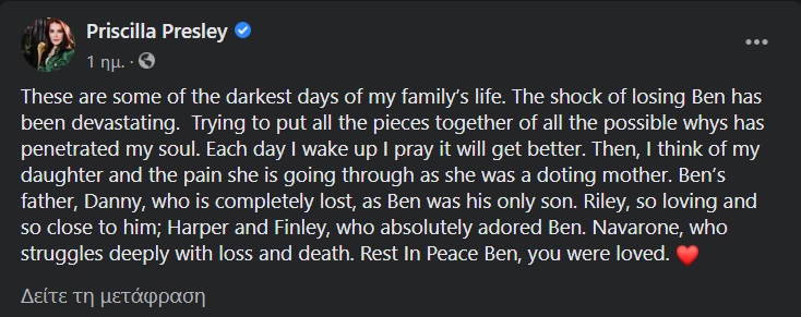 H Πρισίλα Πρίσλεϊ μέσω μίας ανάρτησης στο Facebook άνοιξε την καρδιά της και αναφέρθηκε στις δύσκολες στιγμές που ζει λόγω της αυτοκτονίας του εγγονού της Μπεν.