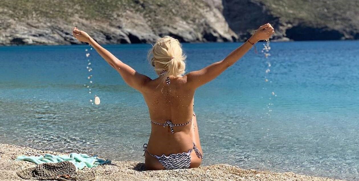 Ένα ξέγνοιαστο καλοκαίρι βιώνει η Ελένη Μενεγάκη που απολαμβάνει τα μπάνια της με την οικογένειά της στα νησιά των Κυκλάδων.
