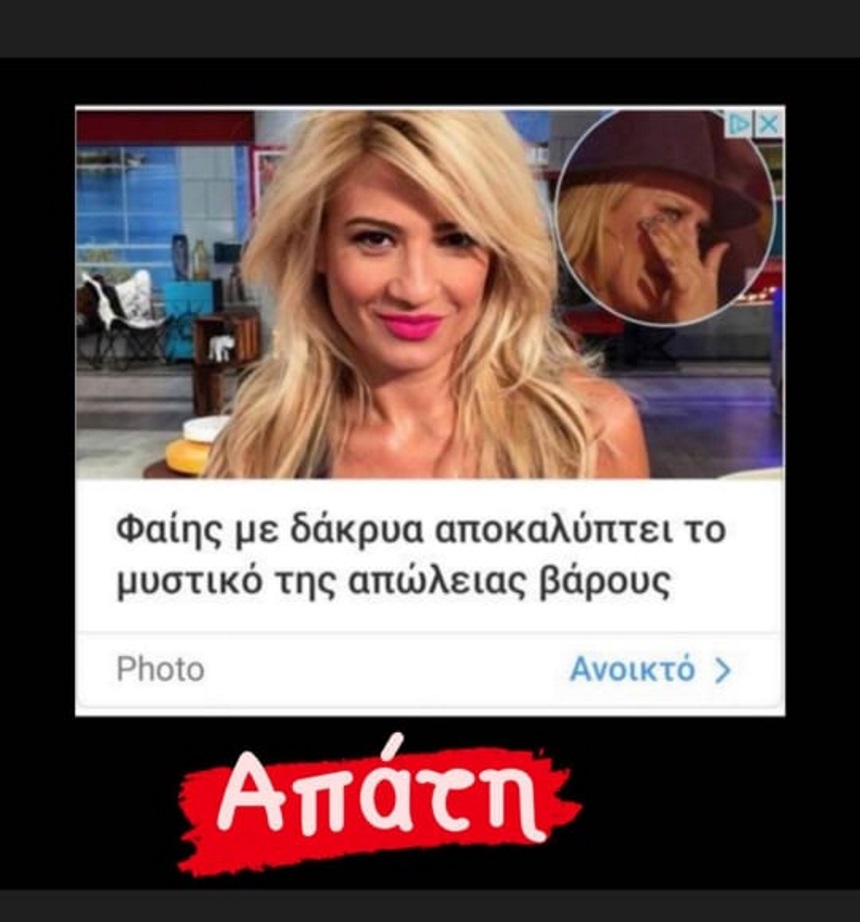 «Μου έστειλαν πολλά μηνύματα σχετικά με μία διαφήμιση και κάτι χάπια αδυνατίσματος…Είναι μία απάτη! Εάν έχω να σας προτείνω κάτι θα σας το προτείνω εγώ μέσα από τα social μου, αλλά επειδή πιστεύω σχετικά με το αδυνάτισμα ότι θαύματα δεν γίνονται, αντιθέτως μπορούν να δημιουργηθούν προβλήματα υγείας παίρνοντας σκευάσματα! Αν υπάρχουν κάποια βοηθήματα είναι συγκεκριμένα και αφορούν ξεχωριστά τον καθένα μας… Δεν πιστεύω ότι μπορούν να γίνουν θαύματα και επειδή με ρωτάτε πολλοί για αυτή τη διαφήμιση και ότι έχω δώσει μία συνέντευξη και την έχουν παραποιήσει… είναι ένα ψεύτικο πράγμα. Το ψάχνω τώρα να δω από πού ξεκίνησε, έχουν αναμιχθεί κι άλλα πρόσωπα», ξεκαθάρισε η Φαίη Σκορδά.