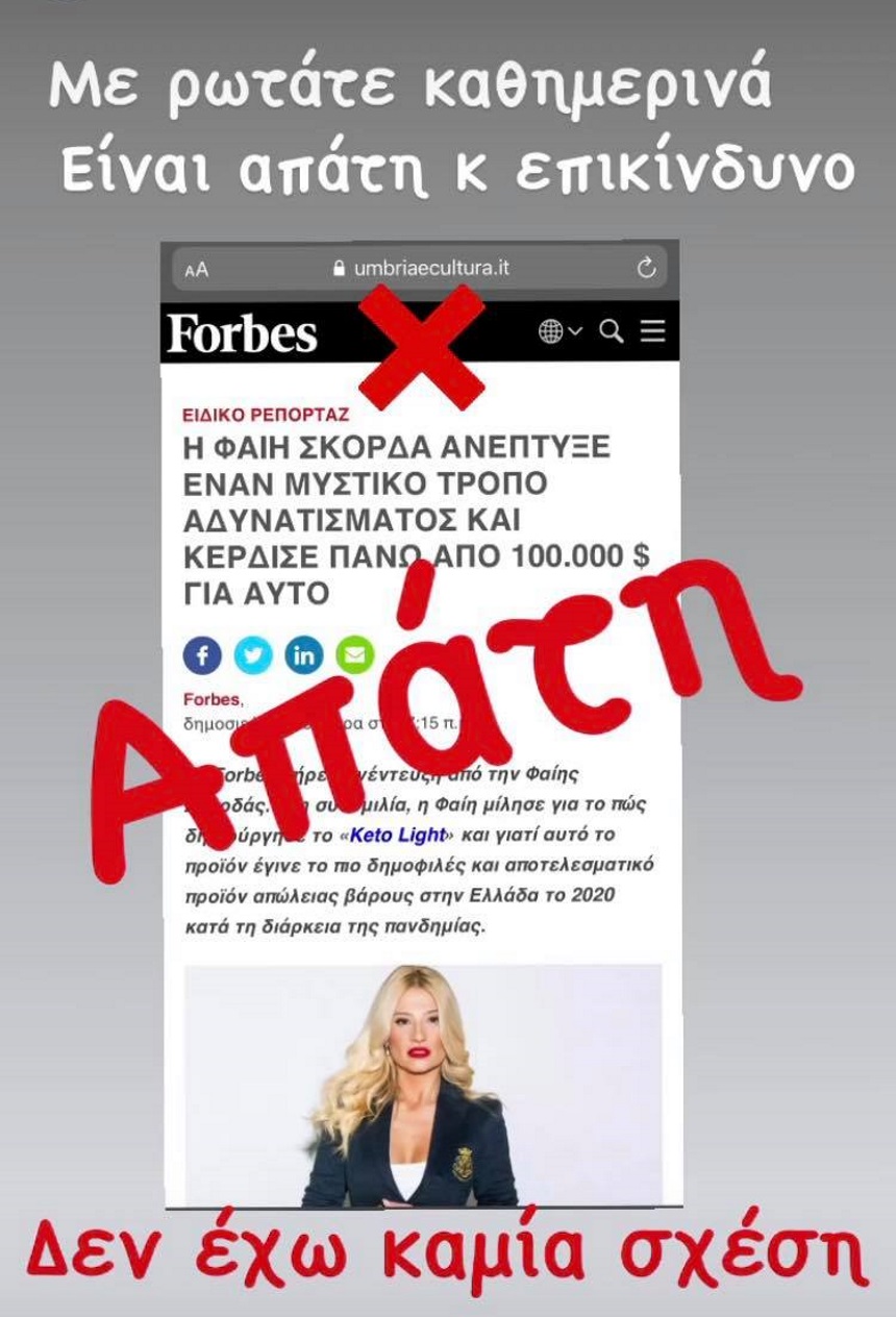 Φαίνεται λοιπόν πως η απάτη εις βάρος της συνεχίζεται. Ειδικότερα, την Πέμπτη η Φαίη Σκορδά κοινοποίησε διάφορα στιγμιότυπα και έγραψε: Με ρωτάτε καθημερινά.. Είναι απάτη και επικίνδυνο. Δεν έχω καμία σχέση».