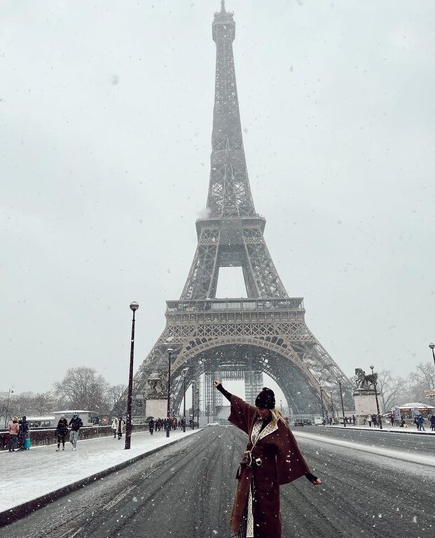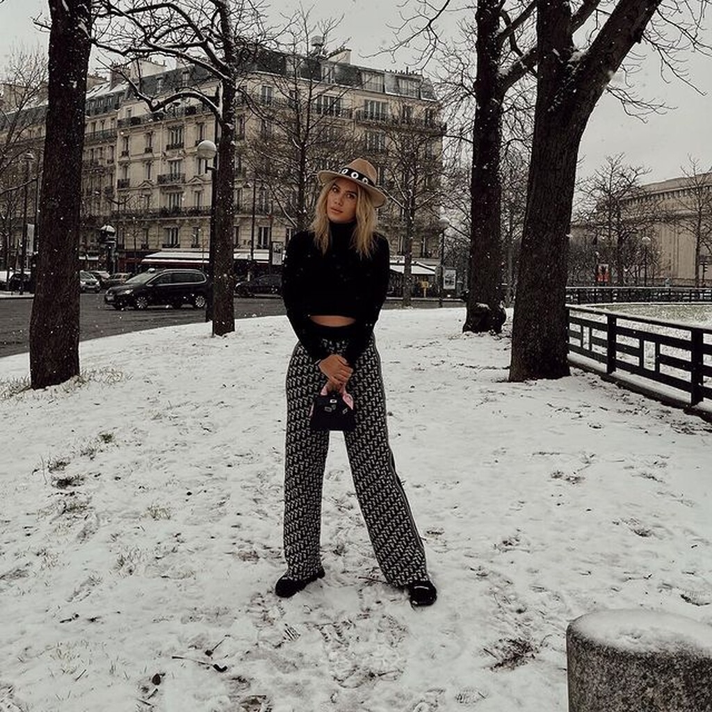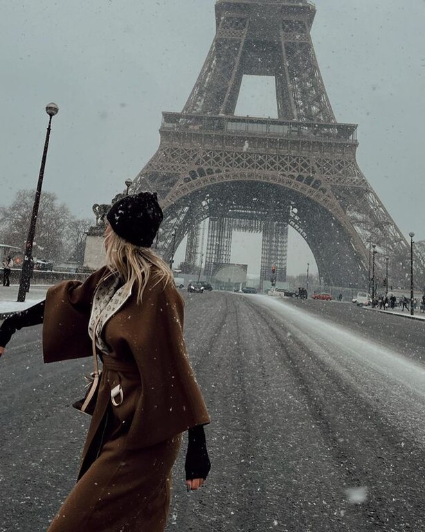 Δε θα μπορούσε λοιπόν να αφήσει ανεκμετάλλευτο το χιονισμένο Παρίσι και πήρε τους δρόμους για να ποζάρει με φόντο τα ολόλευκα τοπία.