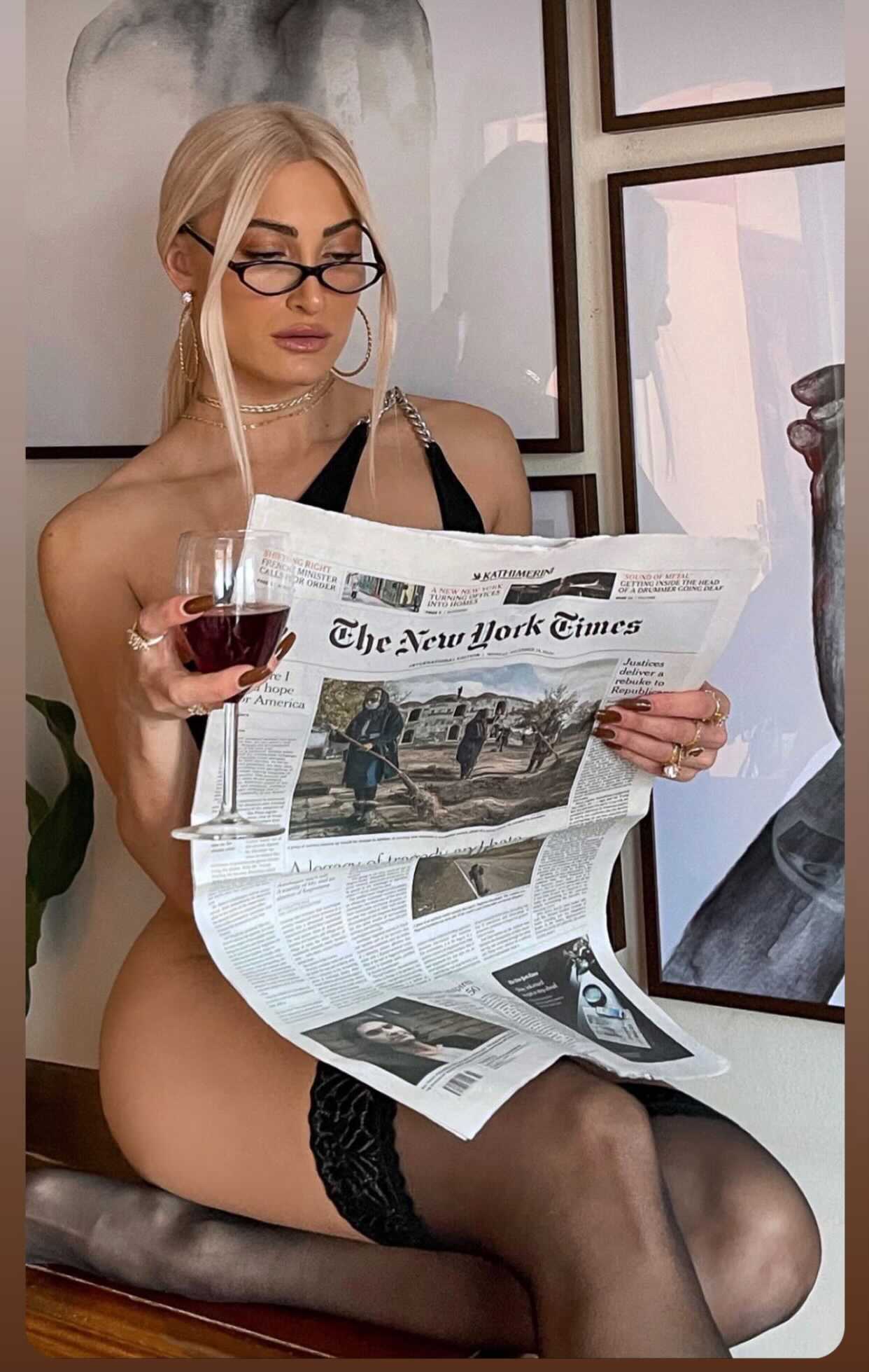 Η «καυτή» ξανθιά κάλυψε το εντυπωσιακό της κορμί μόνο με μία εφημερίδα.
