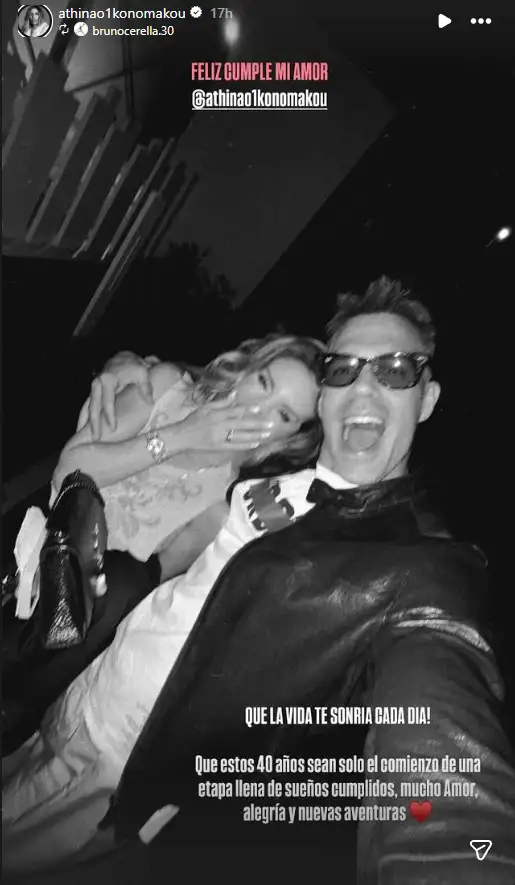 «Χρόνια πολλά αγάπη μου! Εύχομαι η ζωή να σου χαμογελά κάθε μέρα. Αυτά τα 40 χρόνια να αποτελέσουν την αρχή μιας περιόδου γεμάτης όνειρα που πραγματοποιούνται, αγάπη, χαρά και νέες περιπέτειες», έγραψε στο Instagram ο Μπρούνο Τσερέλα και η Αθηνά Οικονομάκου αναδημοσίευσε τις ευχές του στο δικό της προφίλ.