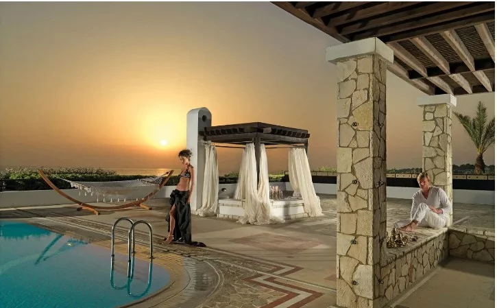 Η σουίτα των 110 τετραγωνικών μπορεί να φιλοξενήσει έως τέσσερα άτομα και κοστίζει 3.000 ευρώ τη βραδιά. Περιλαμβάνει δύο ευρύχωρα υπνοδωμάτια, το ένα με γραφείο, σαλόνι με τραπεζαρία και δύο πολυτελή μαρμάρινα μπάνια με τζακούζι . Έχει επίσης ιδιωτική πισίνα και μπαλκόνι με θέα στη θάλασσα.