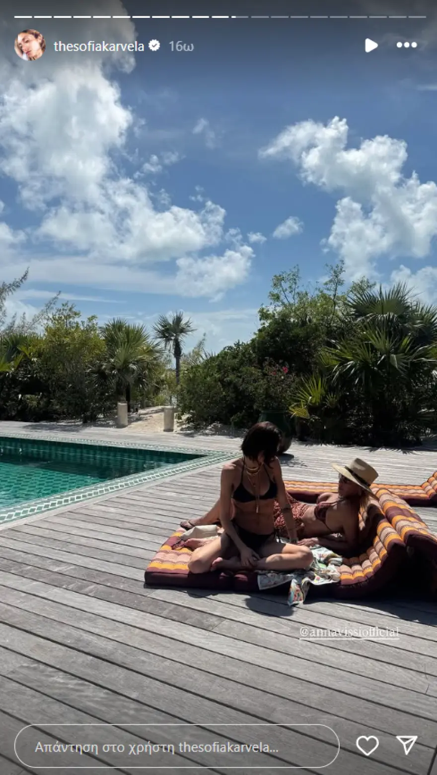 Μαμά και κόρη φωτογραφήθηκαν με το μπικίνι τους, με την Άννα Βίσση να έχει ολοκληρώσει το look της με ένα ψάθινο καπέλο και παρεό. Οι δύο τους δεν κοιτούσαν τον φακό, με την εικόνα που ανάρτησε η Σοφία Καρβέλα, να τις δείχνει να κάθονται σε καναπέ εκτός της πισίνας.