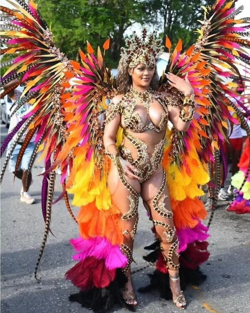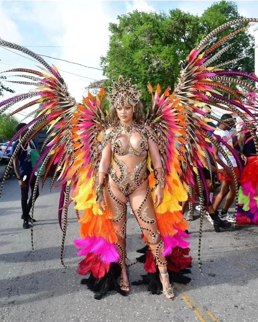 Η 36χρονη τραγουδίστρια έκανε μια μαγευτική επίδειξη στο Crop Over Carnival με ένα εντυπωσιακό ρούχο καλυμμένο με μακριά, πολύχρωμα φτερά που αναδύονταν επιβλητικά από το σώμα της.