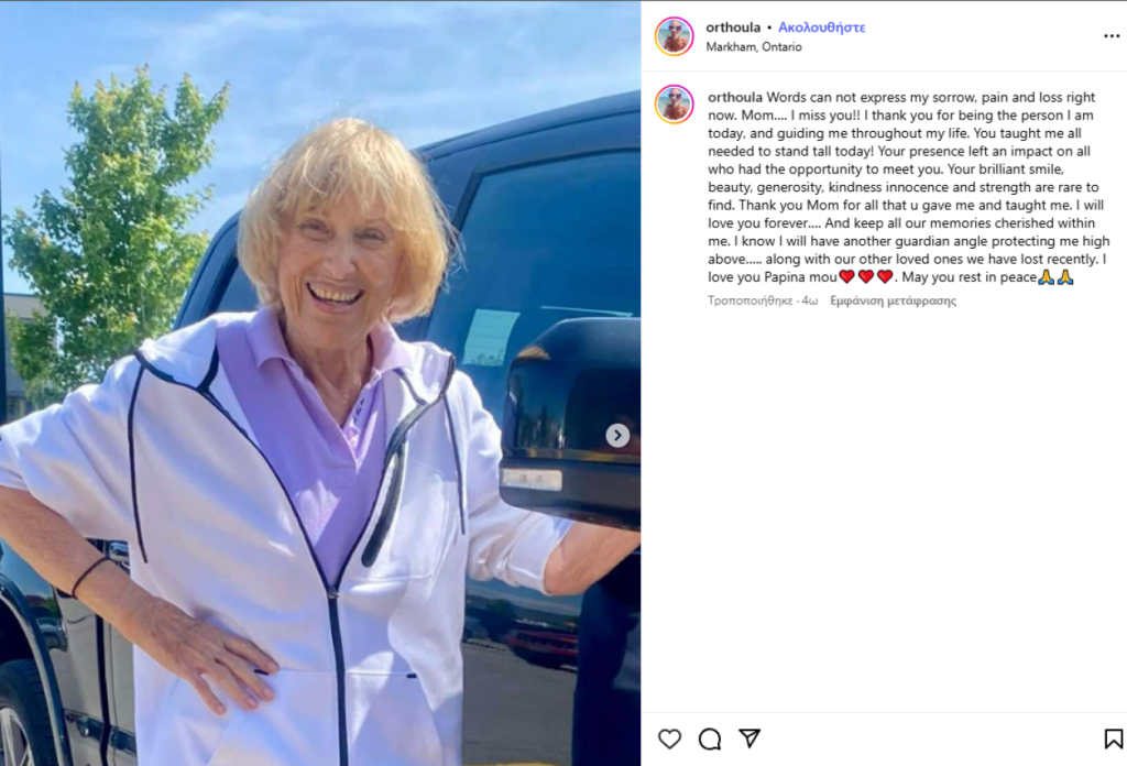 «Δεν υπάρχουν λόγια να εκφράσω τη θλίψη και τον πόνο μου αυτή τη στιγμή. Μαμά… μου λείπεις!! Σε ευχαριστώ που υπήρξες ο άνθρωπος που είμαι σήμερα και που με καθοδήγησες σε όλη μου τη ζωή.