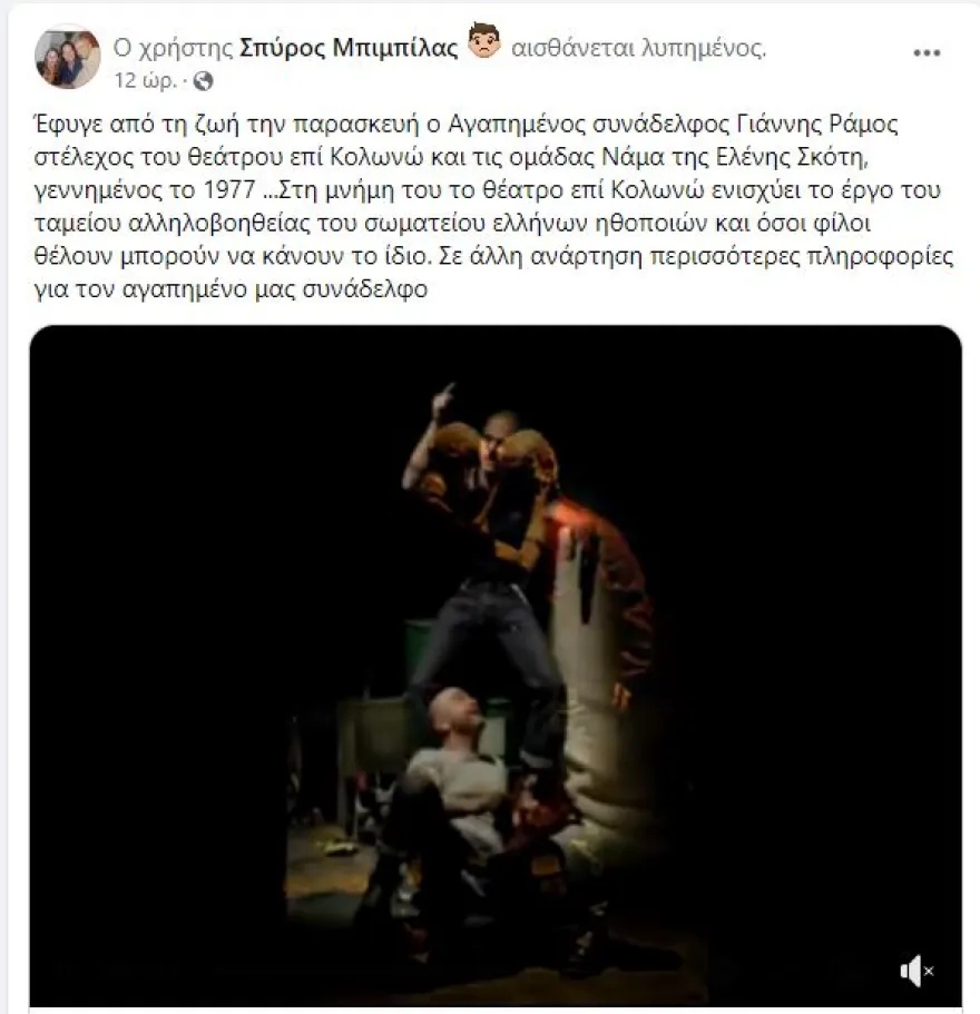 Όπως υπενθύμισε σε ανάρτησή του ο πρόεδρος του Σωματείου Ελλήνων Ηθοποιών, Σπύρος Μπιμπίλας, ο Γιάννης Ράμος ήταν «στέλεχος του θεάτρου επί Κολωνώ και τις ομάδας Νάμα της Ελένης Σκότη, γεννημένος το 1977» προσθέτοντας ότι «στη μνήμη του το θέατρο επί Κολωνώ ενισχύει το έργο του ταμείου αλληλοβοηθείας του σωματείου ελλήνων ηθοποιών και όσοι φίλοι θέλουν μπορούν να κάνουν το ίδιο».