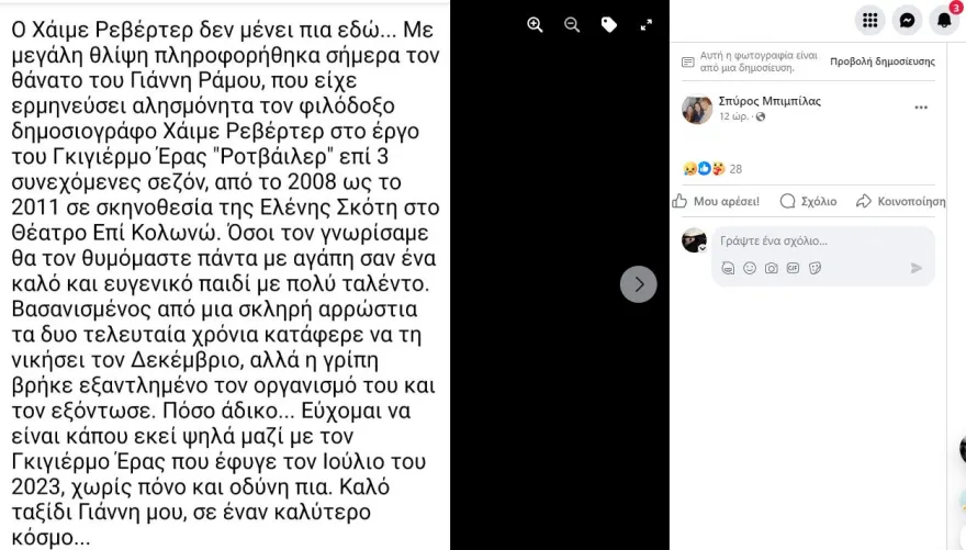 Σε νέα του ανάρτηση για τον Γιάννη Ράμο, ο Σπύρος Μπιμπίλας υπενθυμίζει, επίσης, την ερμηνεία του ηθοποιού στο ρόλο του δημοσιογράφου Χάιμε Ρεβέρτερ στο έργο του Γκιγιέρμο Έρας «Ροτβάιλερ” από το 2008 έως το 2011 και προσθέτει ότι ήταν «βασανισμένος από μια σκληρή αρρώστια τα δύο τελευταία χρόνια κατάφερε να τη νικήσει τον Δεκέμβριο αλλά η γρίπη βρήκε εξαντλημένο τον οργανισμό του και τον εξόντωσε».