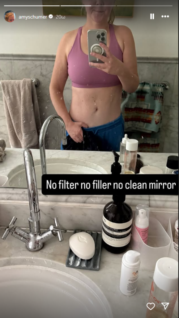 Η κωμική ηθοποιός ανέβασε στον προσωπικό της λογαριασμό στο Instagram μια selfie που τράβηξε στον καθρέφτη του μπάνιου της και τη δείχνει να ποζάρει φορώντας ένα αθλητικό μπουστάκι και φόρμα.