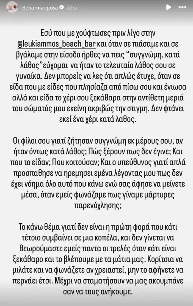 «Εσύ που με χούφτωσες πριν λίγο στην @leukiamnos_beach_bar και όταν σε πιάσαμε και σε βγάλαμε στην είσοδο ήρθες να πεις “συγγνώμη, κατά λάθος” εύχομαι να ήταν το τελευταίο λάθος σου σε γυναίκα.