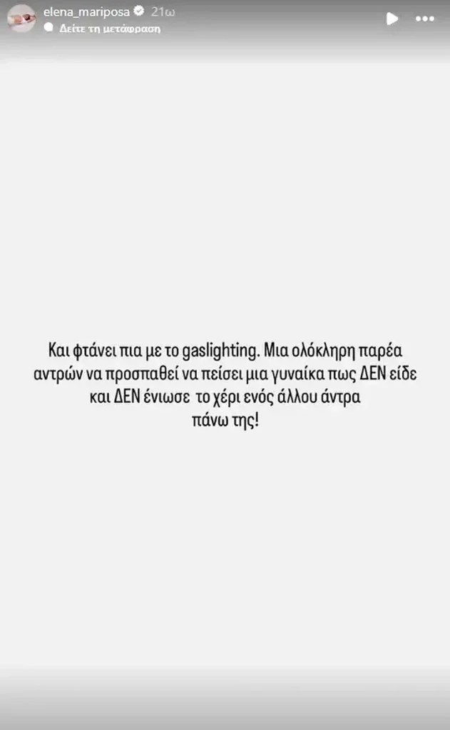 «Και φτάνει πια με το gaslighting. Μια ολόκληρη παρέα αντρών να προσπαθεί να πείσει μια γυναίκα πως δεν είδε και δεν ένιωσε το χέρι ενός άλλου άντρα πάνω της», έγραψε σε μία δεύτερη ανάρτηση η Έλενα Κρεμλίδου.