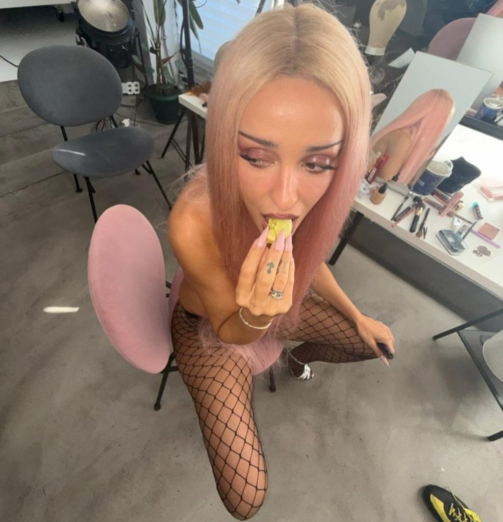 Στη μια απολαμβάνει ένα φρούτο σε διάλειμμα από τις εμφανίσεις της και στη δεύτερη ποζάρει έξω από την είσοδο ενός κτηρίου.