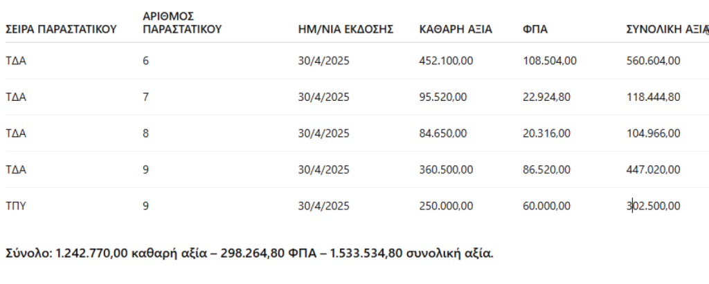 Σύμφωνα με πληροφορίες, από την άρση τραπεζικού απορρήτου της «MEGA SPECIAL CONSTRUCTIONS Μονοπρόσωπη ΙΚΕ» που ανήκει στον φερόμενο ως εγκέφαλο πρόεδρο του Αχαρναϊκού Άρη Ηλιάδη εντοπίστηκαν πέντε τιμολόγια πώλησης, ύψους 1.533.534,80 ευρώ, εκδοθέντα τον Απρίλιο 2025 προς την «BARKINGWELL MEDIA AE» του τηλεοπτικού παραγωγού, Νίκου Κοκλώνη, με τον οποίο ο Ηλιάδης συνομιλούσε τακτικά για τις επιστροφές Φ.Π.Α. που ανέμενε στις «εικονικές» εταιρείες που διαχειριζόταν.