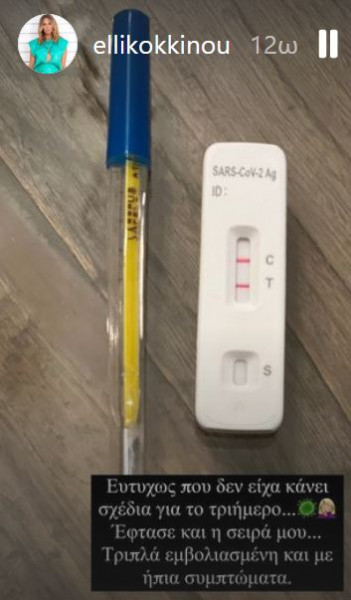 «Ευτυχώς που δεν είχα κάνει σχέδια για το τριήμερο. Έφτασε και η σειρά μου. Τριπλά εμβολιασμένη και με ήπια συμπτώματα», έγραψε συγκεκριμένα η Έλλη Κοκκίνου δείχνοντάς μας σε μια φωτογραφία το θετικό self test και το θερμόμετρο με το οποίο μετρά τη θερμοκρασία της.
