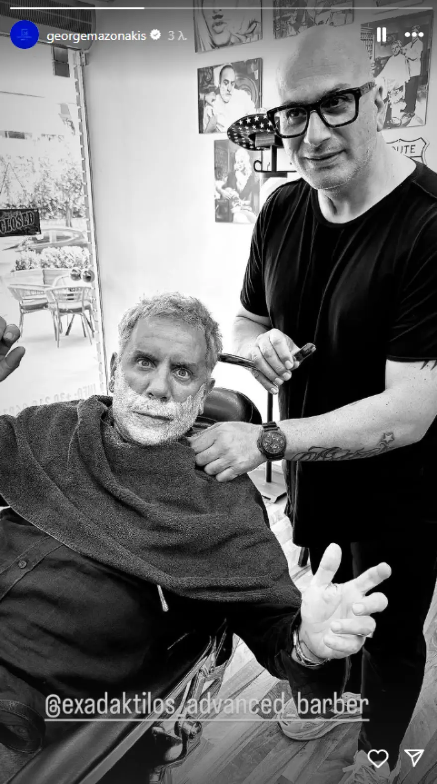 Στη φωτογραφία, ο Γιώργος Μαζωνάκης φαίνεται καθισμένος στην καρέκλα του κουρείου, με αφρό ξυρίσματος στο πρόσωπο, αποτυπώνοντας τη στιγμή της φροντίδας της εμφάνισής του.