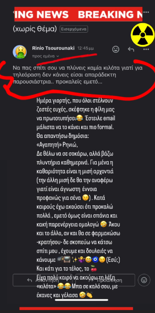 «Να πας σπίτι σου να πλύνεις καμία κιλότα, γιατί στην τηλεόραση δεν κάνεις. Είσαι απαράδεκτη παρουσιάστρια, προκαλείς εμετό», της έγραψε η γυναίκα με το username «Rinio Tsourounaki».