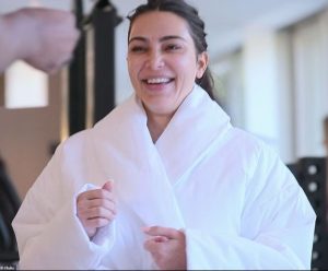 Η Κιμ Καρντάσιαν κατέβηκε για να τους συναντήσει το πρωί με ένα ασυνήθιστα μη κολακευτικό ντύσιμο – μια σούπερ φουσκωμένη ολόσωμη λευκή ρόμπα χωρίς μακιγιάζ, ενώ τα μαλλιά της τα έχει πιασμένα πίσω σε αλογοουρά.