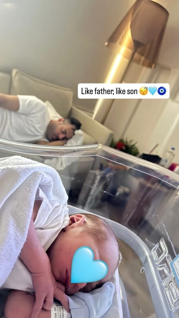 «Like father, like son» έγραψε η Δώρα Παντέλη στην ανάρτησή της, στην οποία έκρυψε το πρόσωπο του νεογέννητου γιου της με μια μεγάλη γαλάζια καρδιά.
