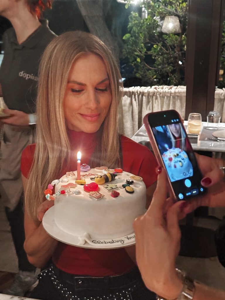 Σε μία από αυτές, όπως μπορούμε να δούμε, η Ντορέττα Παπαδημητρίου ποζάρει κρατώντας την τούρτα της.