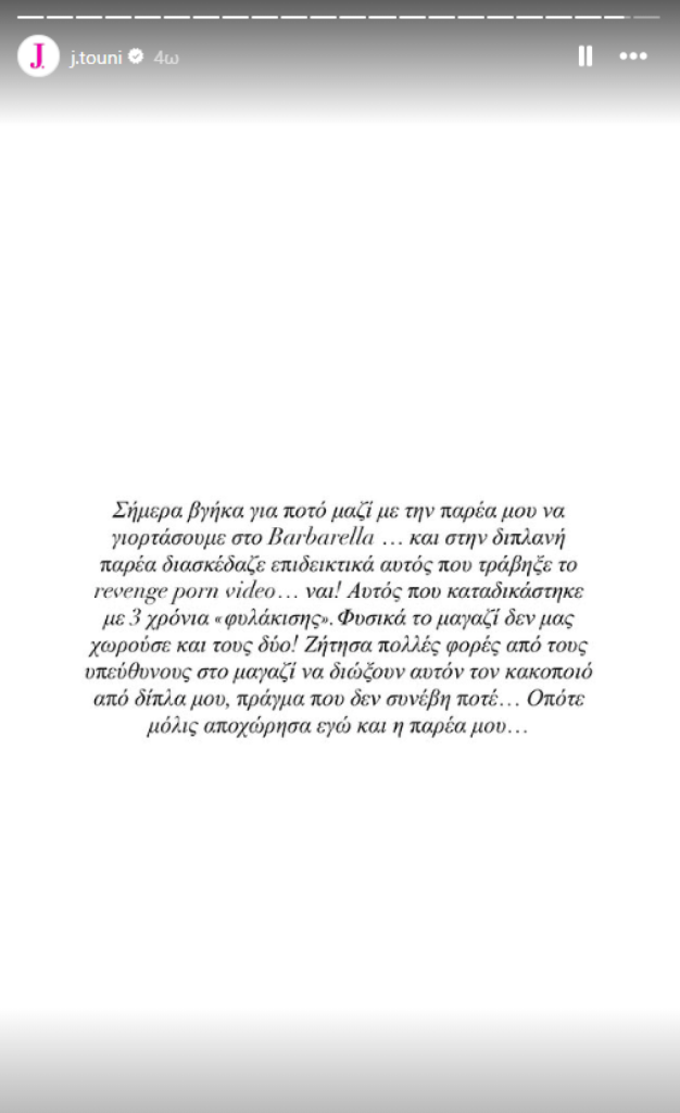 Οργή και θυμό κρύβει η ανάρτηση της Ιωάννας Τούνη για το κέντρο διασκέδασης στο οποίο βγήκε μαζί με την παρέα της, με έναν εκ των δύο ανδρών που συμμετέχουν στο βίντεο της υπόθεσης revenge porn να βρίσκεται δίπλα της.