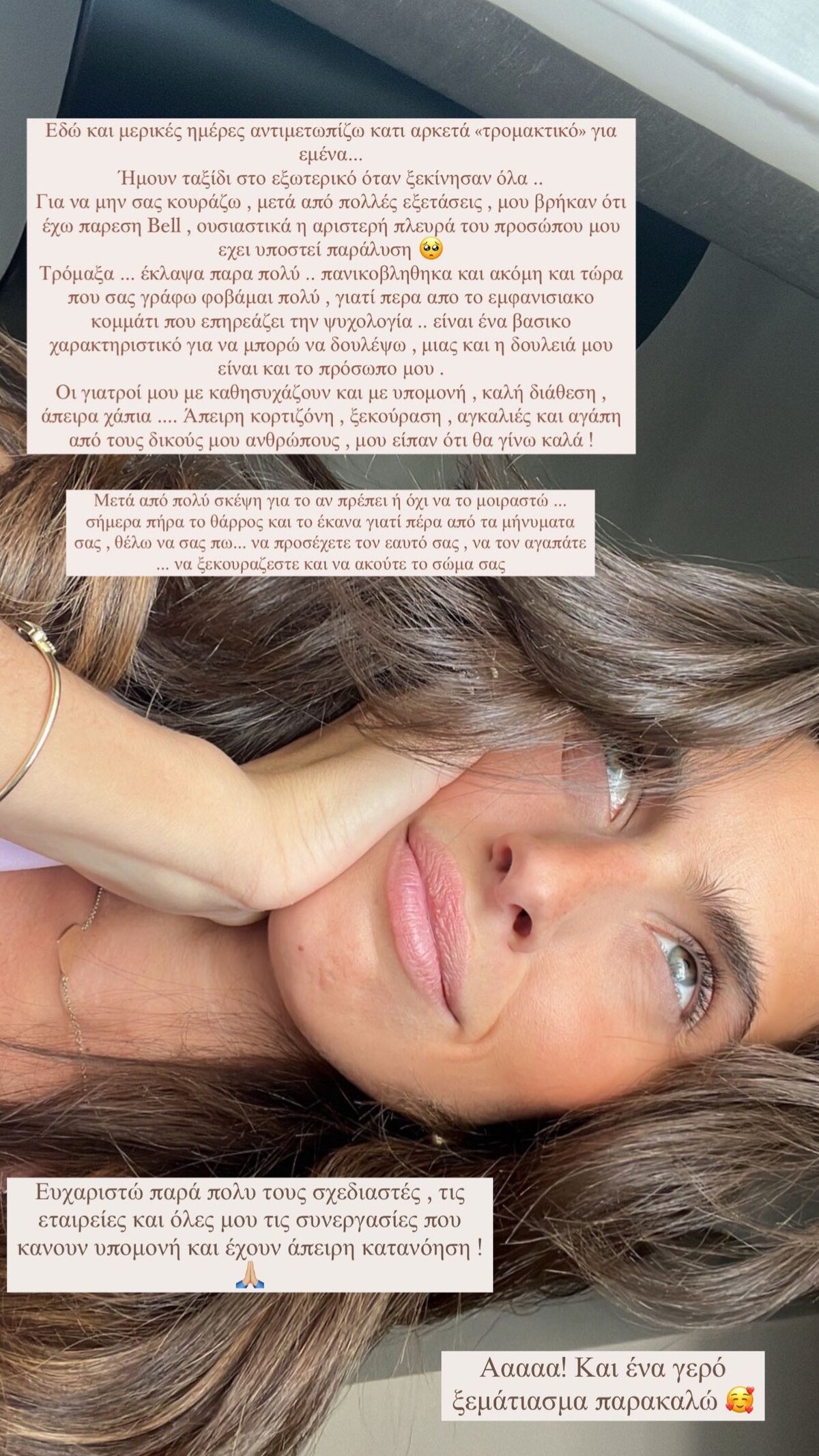 «Εδώ και μερικές ημέρες αντιμετωπίζω κάτι τρομακτικό για εμένα. Ήμουν ταξίδι στο εξωτερικό όταν ξεκίνησαν όλα… Για να μην σας κουράζω, μετά από πολλές εξετάσεις, μου βρήκαν ότι έχω πάρεση Bell. Ουσιαστικά η αριστερή πλευρά του προσώπου μου έχει υποστεί παράλυση. Τρόμαξα, έκλαψα πολύ, πανικοβλήθηκα και ακόμα και τώρα που σας γράφω φοβάμαι πολύ, γιατί πέρα από το εμφανισιακό κομμάτι που επηρεάζει την ψυχολογία, είναι ένα βασικό χαρακτηριστικό για να μπορώ να δουλέψω μιας και η δουλειά μου είναι και το πρόσωπο μου. Οι γιατροί μου με καθησυχάζουν και με υπομονή, καλή διάθεση, άπειρα χάπια, άπειρη κορτιζόνη, ξεκούραση, αγκαλιές και αγάπη από τους δικούς μου ανθρώπους, μου είπαν ότι θα γίνω καλά.