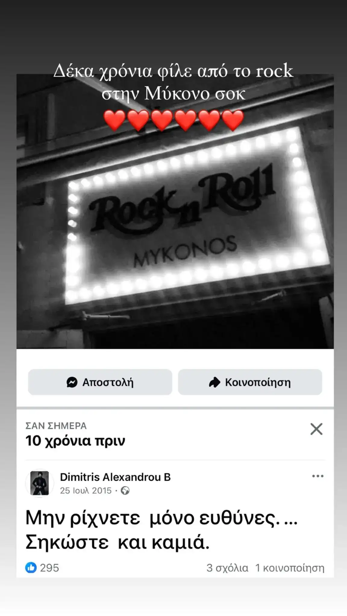 Αν και μέχρι στιγμής ο ίδιος δεν έχει κάνει κάποια επίσημη δήλωση, φαίνεται πως δεν έμεινε άπραγος. Αντί να μπει σε δημόσια αντιπαράθεση, ο Δημήτρης Αλεξάνδρου προτίμησε να απαντήσει με τον δικό του τρόπο: ένα story στον λογαριασμό του στο Instagram, με φωτογραφία από το «Rock n Roll» στη Μύκονο.