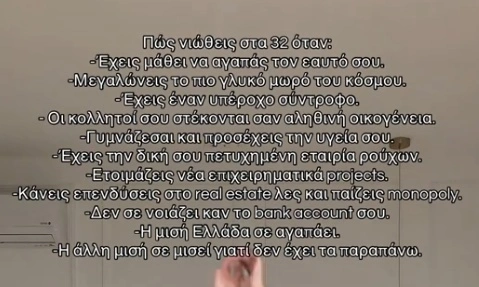 Στο συγκεκριμένο στιγμιότυπο, η influencer φαίνεται χαλαρή και με καλή διάθεση, να χορεύει, ενώ παράλληλα προβάλλονται στην οθόνη σκέψεις γύρω από τη ζωή στα 32, που αγγίζουν ζητήματα καριέρας, προσωπικών σχέσεων και αυτοφροντίδας.