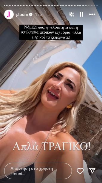 Η Ιωάννα Τούνη που ενημερώθηκε από την τηλεόραση για το εν λόγω απόσπασμα δεν έκρυψε την ενόχλησή της με την παράνομη βιντεοσκόπηση αλλά και τα σχόλια του δημοσιογράφου. Έτσι, μέσα από τον λογαριασμό της στο Instagram ξέσπασε δημόσια.