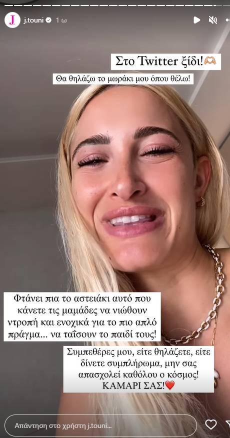 Και σε αυτό το ταξίδι, η Ιωάννα Τούνη βρέθηκε στο επίκεντρο των σχολιαστών του Twitter, οι οποίο μάλιστα, την βομβάρδισαν με αρνητικά σχόλια όταν δημοσίευσε ένα βίντεο στο Instagram, όπου θηλάζει τον γιο της σε δημόσιο χώρο.