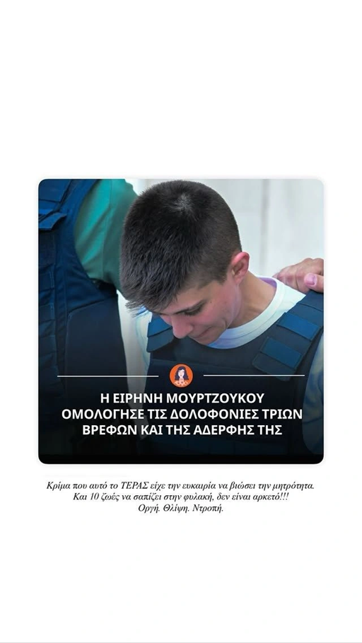 Η Ιωάννα Τούνη με ανάρτησή της στον προσωπικό της λογαριασμό στο Instagram αναφέρθηκε στην ομολογία της Ειρήνης Μουρτζούκου για τη δολοφονία τεσσάρων παιδιών.