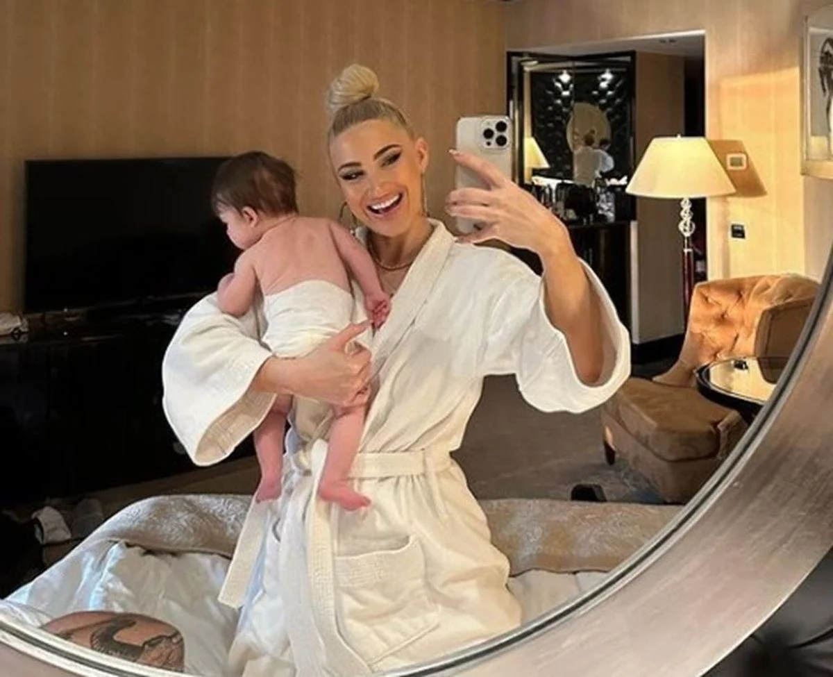 Ειδικότερα, η γνωστή influencer, πόζαρε αγκαλιά με το «νουνίτο» με φόντο το πανέμορφο ηλιοβασίλεμα της Σαντορίνης.