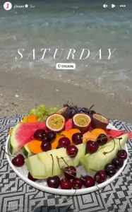 Λίγο αργότερα δημοσίευσε και το σνακ που απόλαυσε με την παρέα της, το οποίο δεν ήταν άλλο από μία πιατέλα με δροσερά φρούτα, όπως καρπούζι, σταφύλια, κεράσια, πεπόνι και passion fruits.