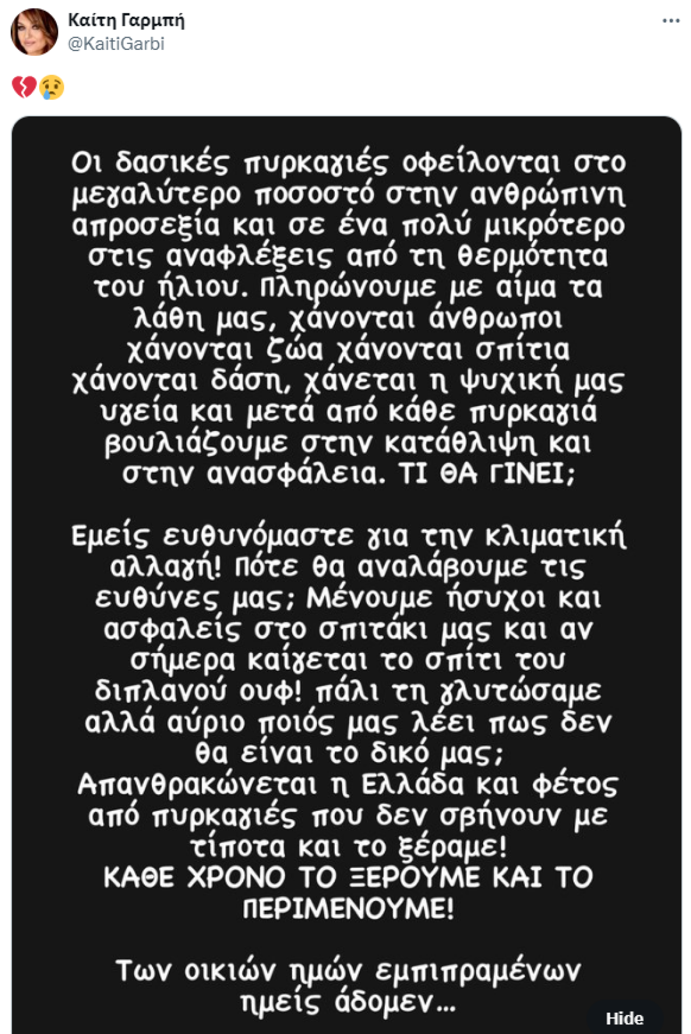 Η Καίτη Γαρμπή, με αφορμή τις φωτιές που καίνε στην Αττική, τόνισε σε ανάρτησή της στα μέσα κοινωνικής δικτύωσης πως «απανθρακώνεται η Ελλάδα και φέτος από πυρκαγιές που δεν σβήνουν με τίποτα».