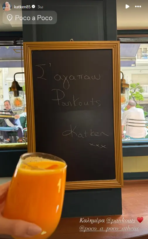 Συγκεκριμένα, έγραψε σε έναν πίνακα του μαγαζιού: «Σ’ αγαπάω PanKouts, Katken», το οποίο και μοιράστηκε με ένα Instagram story με τους διαδικτυακούς της φίλους. Στη συνέχεια πρόσθεσε: «Καλημέρα».