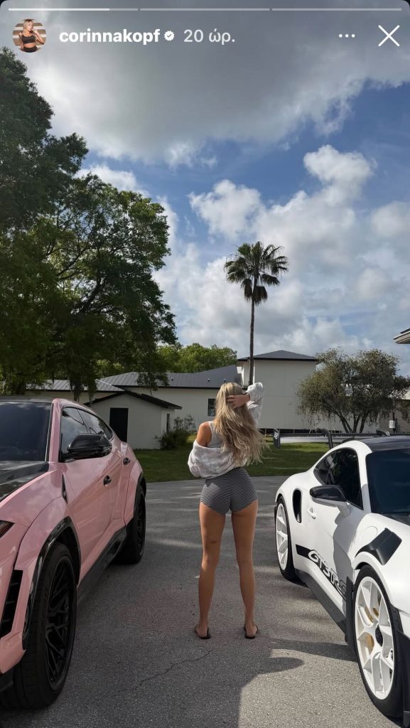Σε ένα από τα στιγμιότυπα που ανάρτησε, ποζάρει με… την πίσω όψη ανάμεσα σε δύο πανάκριβα αυτοκίνητα.