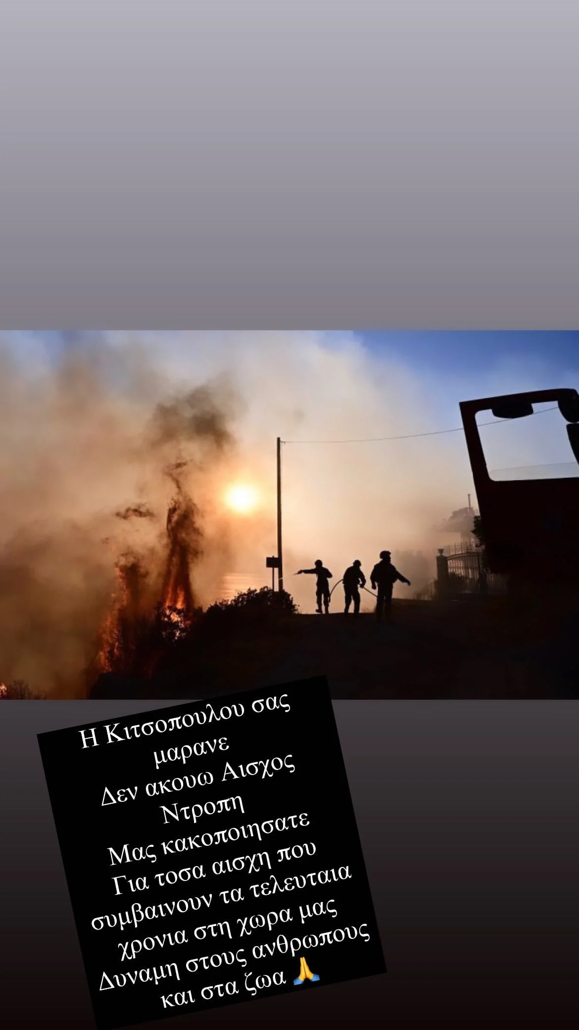 «Η Κιτσοπούλου σας μάρανε. Δεν ακούω: Αίσχος!, Ντροπή!, Μας κακοποιήσατε!, για τόσα αίσχη που συμβαίνουν τα τελευταία χρόνια στη χώρα μας. Δύναμη στους ανθρώπους και στα ζώα», έγραψε αρχικά στο story που ανέβασε.