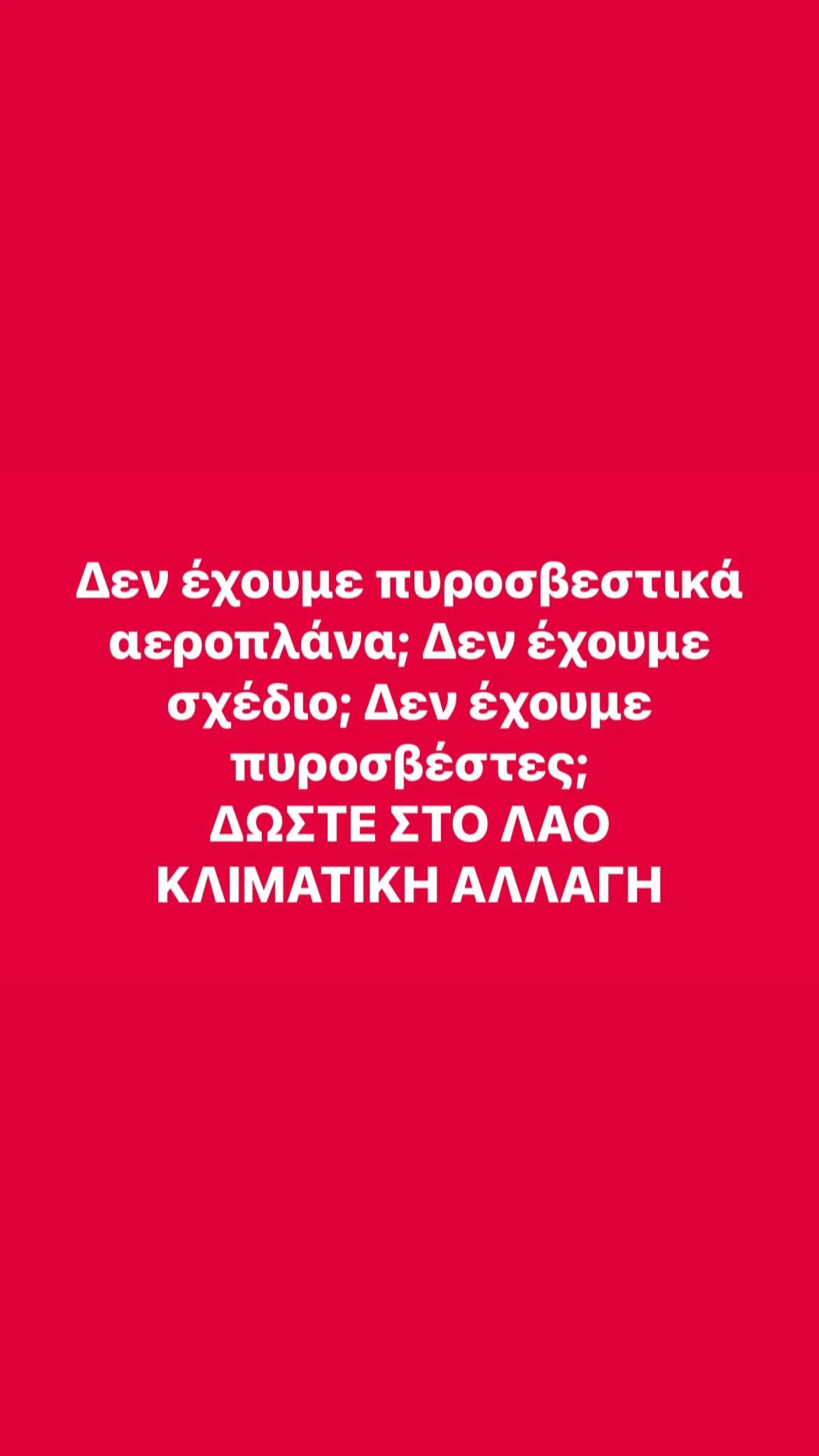 «Δεν έχουμε πυροσβεστικά αεροπλάνα; Δεν έχουμε σχέδιο; Δεν έχουμε πυροσβέστες; ΔΩΣΤΕ ΣΤΟΝ ΛΑΟ ΚΛΙΜΑΤΙΚΗ ΑΛΛΑΓΗ», έγραψε σε δεύτερο χρόνο.