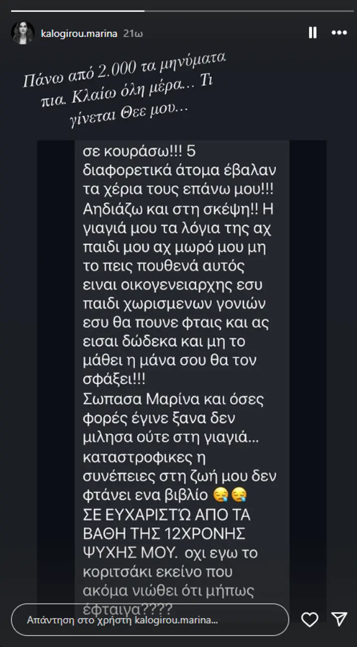 Η Μαρίνα Καλογήρου μετά την εξομολόγησή της για σεξουαλική κακοποίηση που υπέστη όταν ήταν ανήλικη, αποκάλυψε με ανάρτησή της στα μέσα κοινωνικής δικτύωσης πως έχει λάβει πάνω από 2.000 μηνύματα από άλλα θύματα.